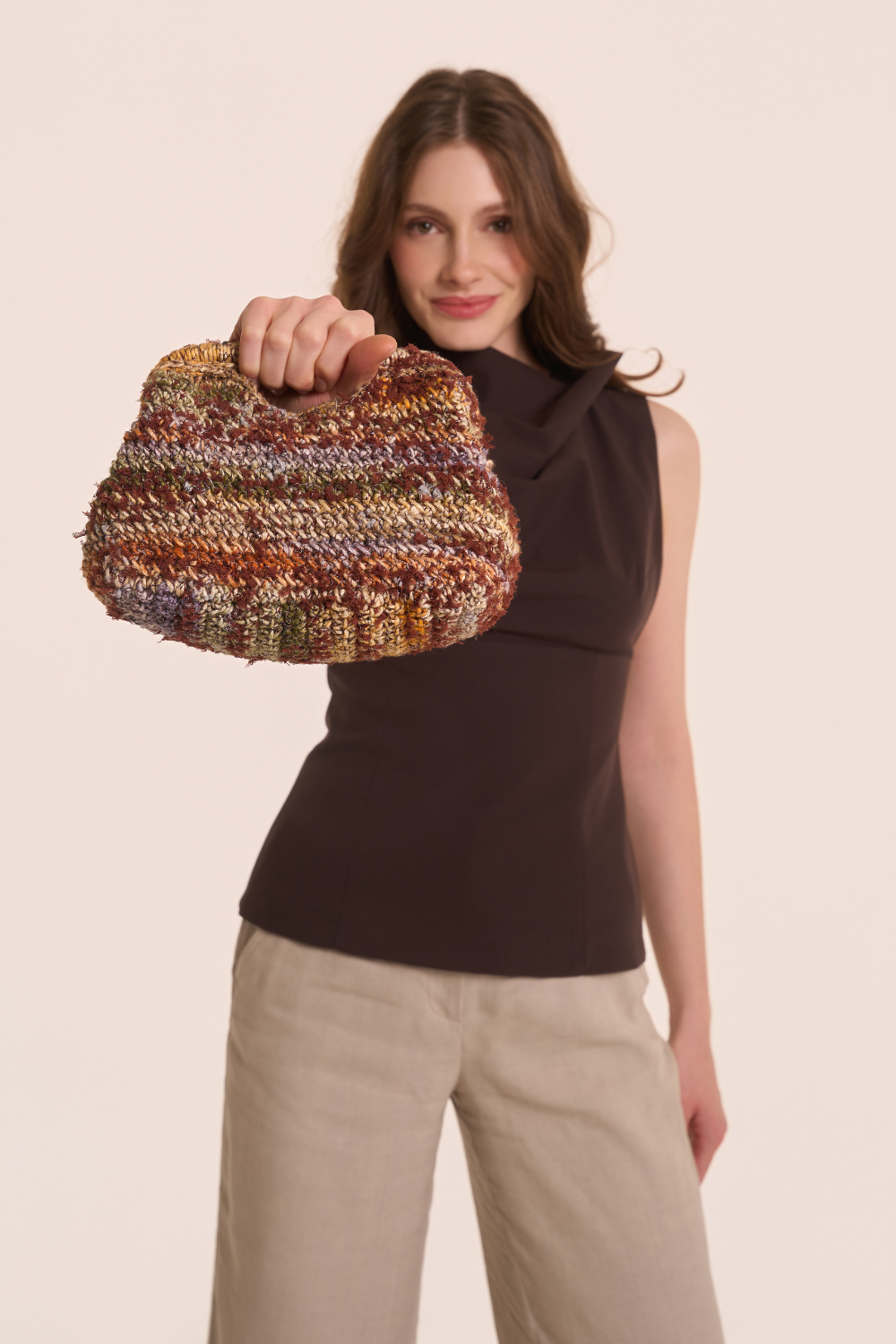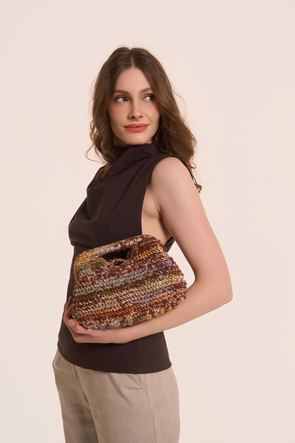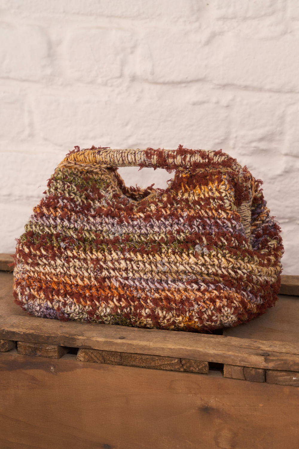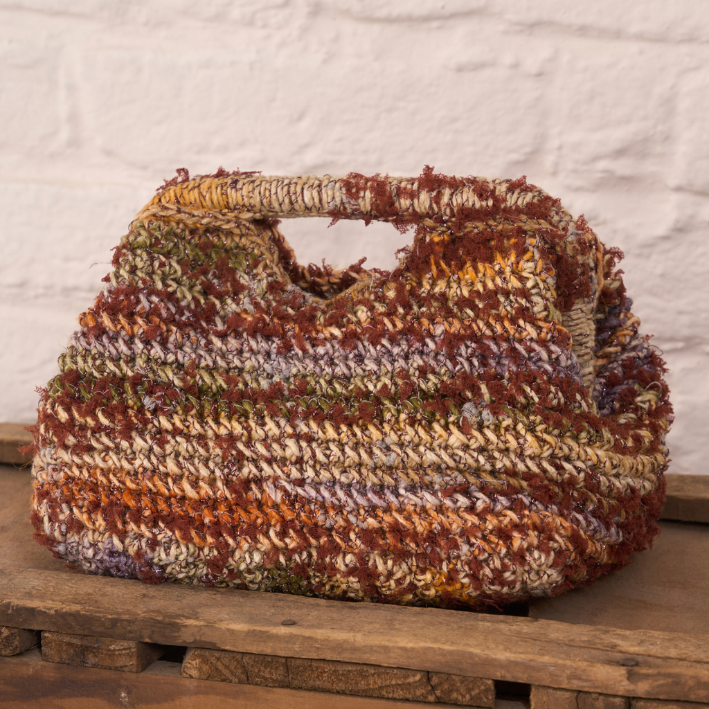 Der Boden der Tasche wird in Hin- und Rückreihen gearbeitet. Der erste Teil des Taschenkörpers wird um den Umfang des Bodens herum gearbeitet, indem man in einer durchgehenden Spirale von M. arbeitet, ohne jede Runde mit 1 Kettm zu schließen. Um die Ausführung zu erleichtern, 1 Kettm in die 1. M. jeder Runde einfügen und diese nach und nach, nach oben verschieben.