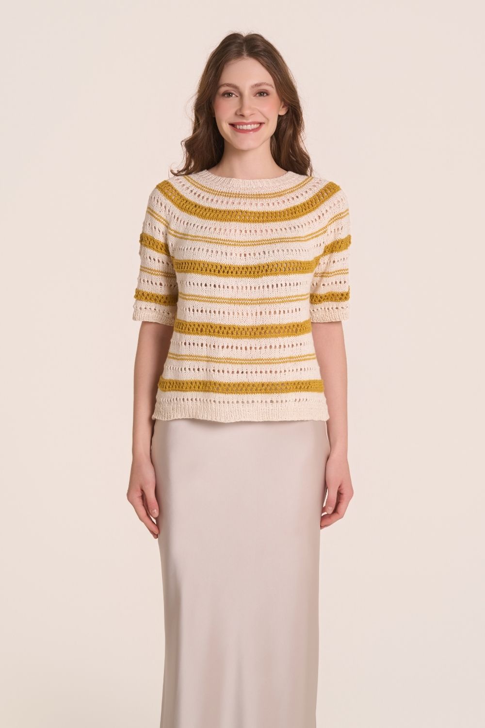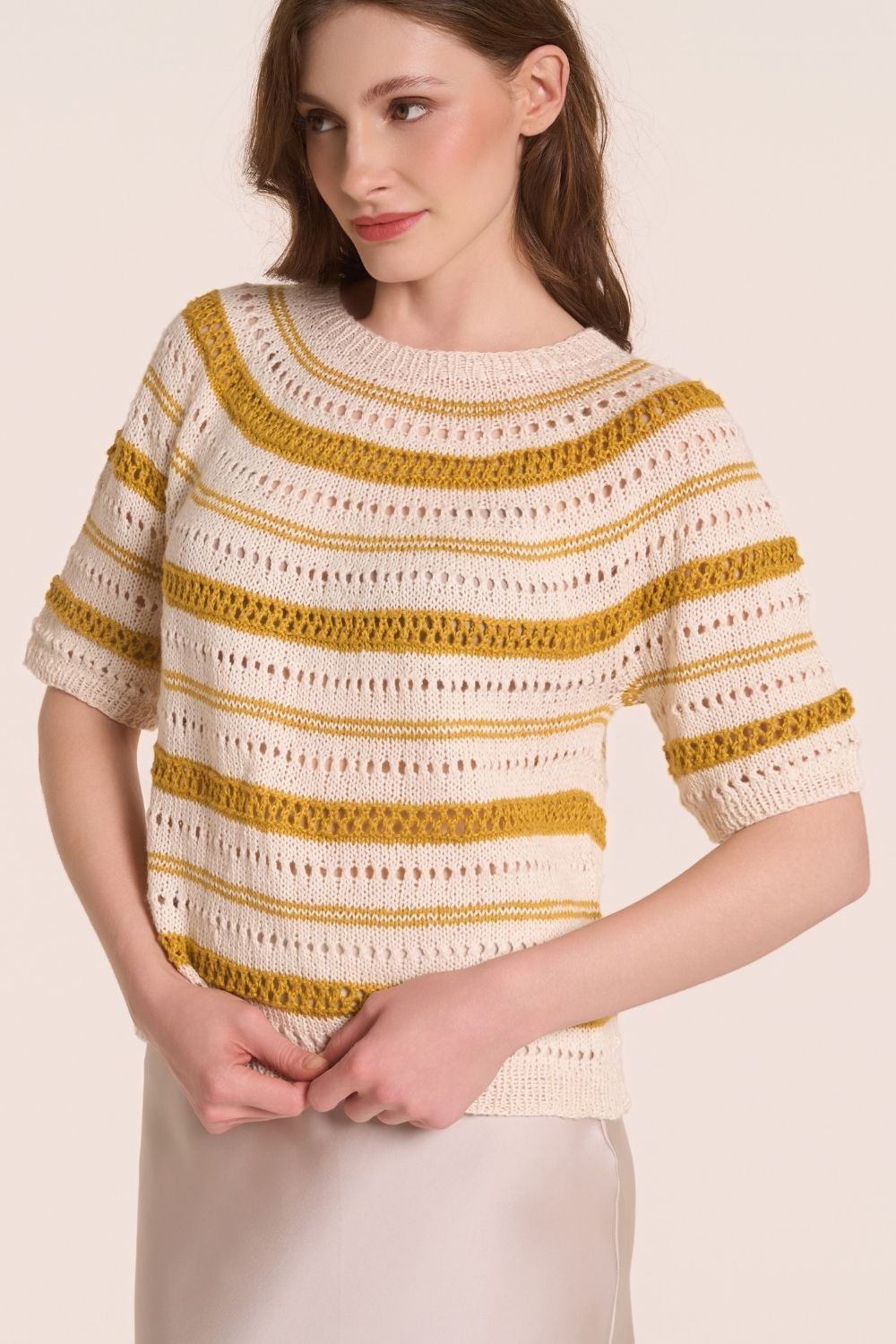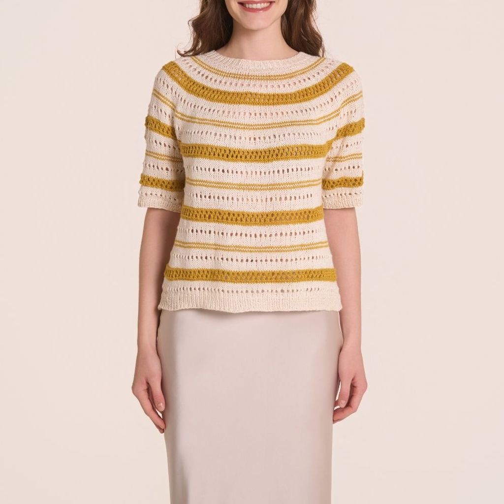 Garn = SOFT LINO von LAINES DU NORD, Knäuel zu 50 gr (135 m) Größen M (S; L): 5 (5; 6) Knäuel Fb weiß (1) Größen M (X;L): 3 (2; 3) Knäuel ockergelb (50)