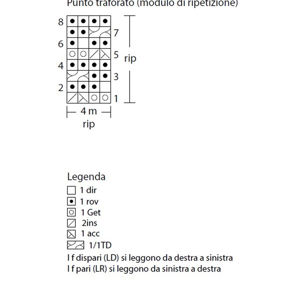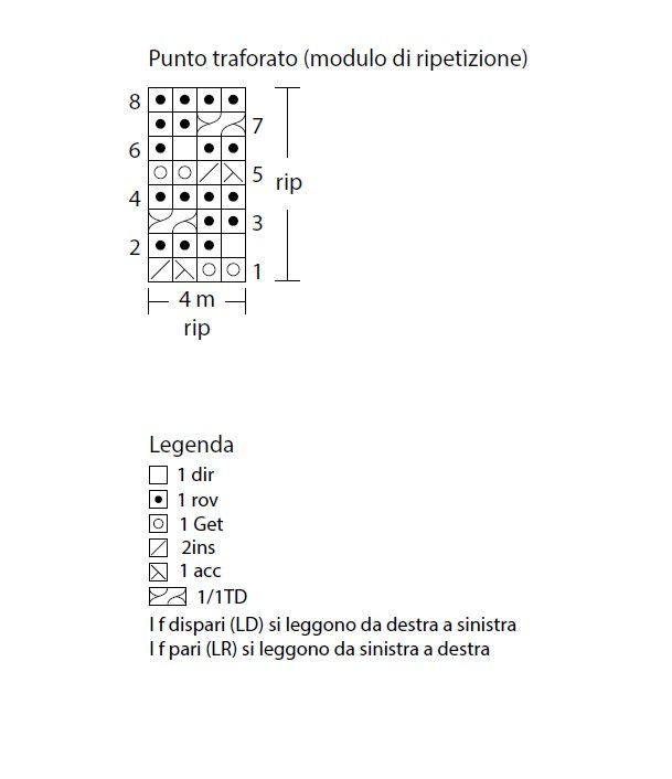 Punto traforato: si lavora sulla base di un numero di m. multiplo di 4, seguendo le istruzioni dettagliate del capo e lo schema.
