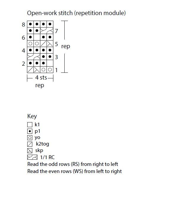 95° f.: 3 rov, 3rovins, 1 rov, 1/1 TD, 2 rov, * 1/1 TD, 2 rov * rip ** fino a 7 m dalla fine, 1/1 TD, 1 rov, 4 rov.
