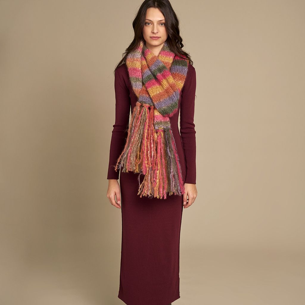 Frange: per ogni frangia, tagliare 4 o 5 fili da 60 cm di lunghezza, raggrupparli e piegarli a metà, inserire l'unc attraverso 1 m di margine di un lato corto della sciarpa, agganciare il punto di piegatura del gruppo di fili e tirarlo attraverso la m di base, estraendo un'asola, far passare le