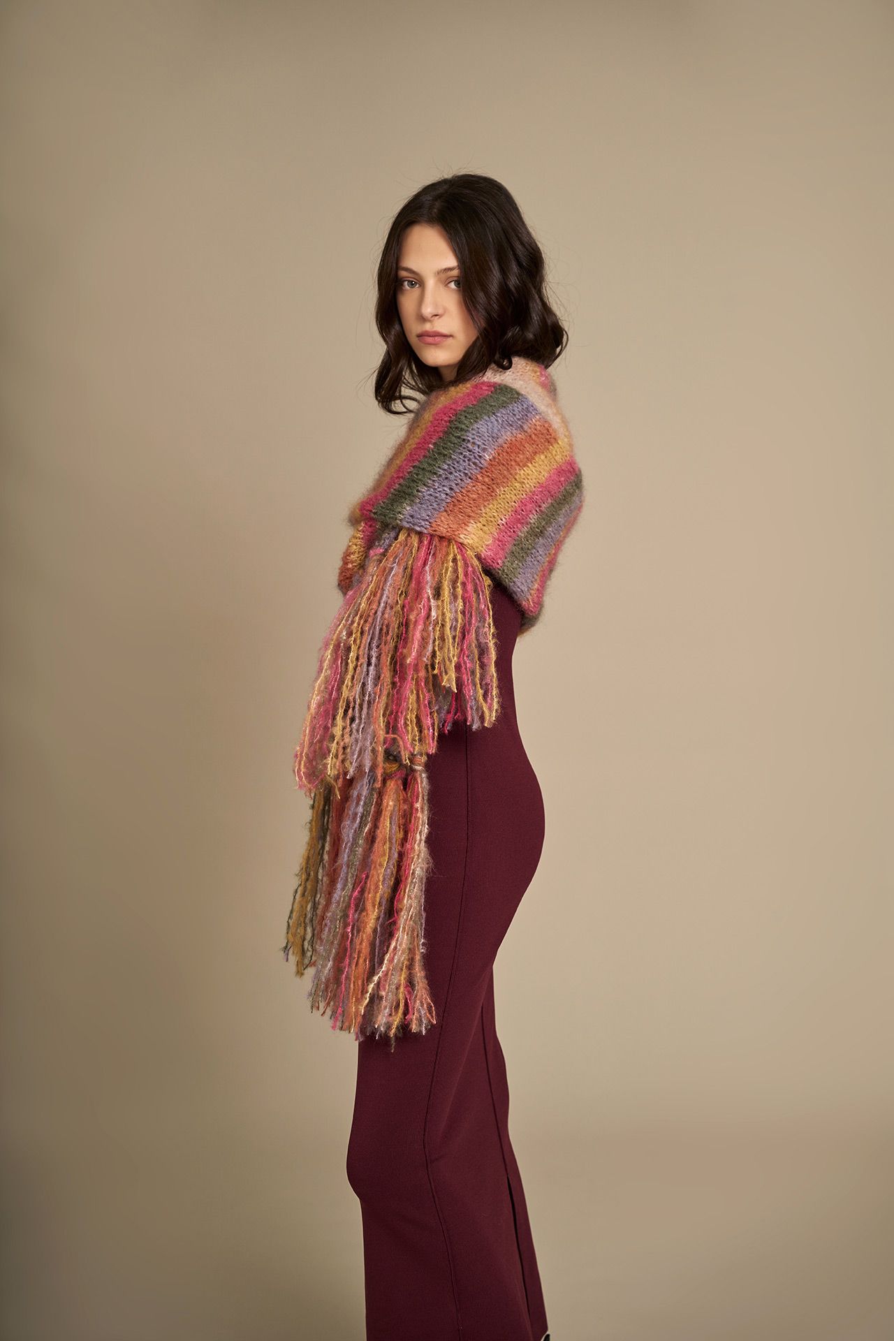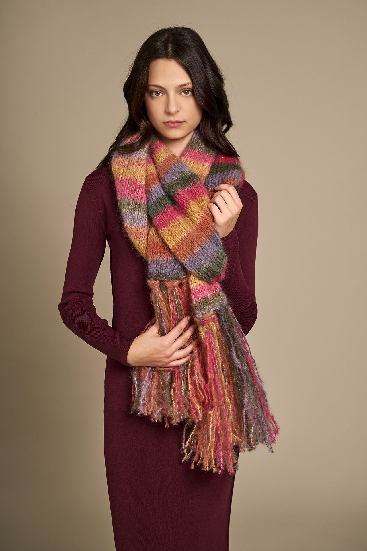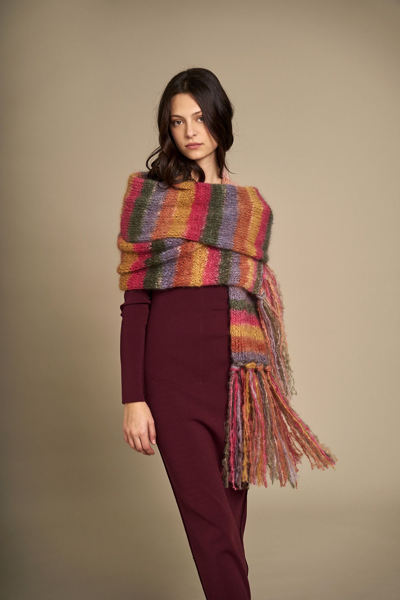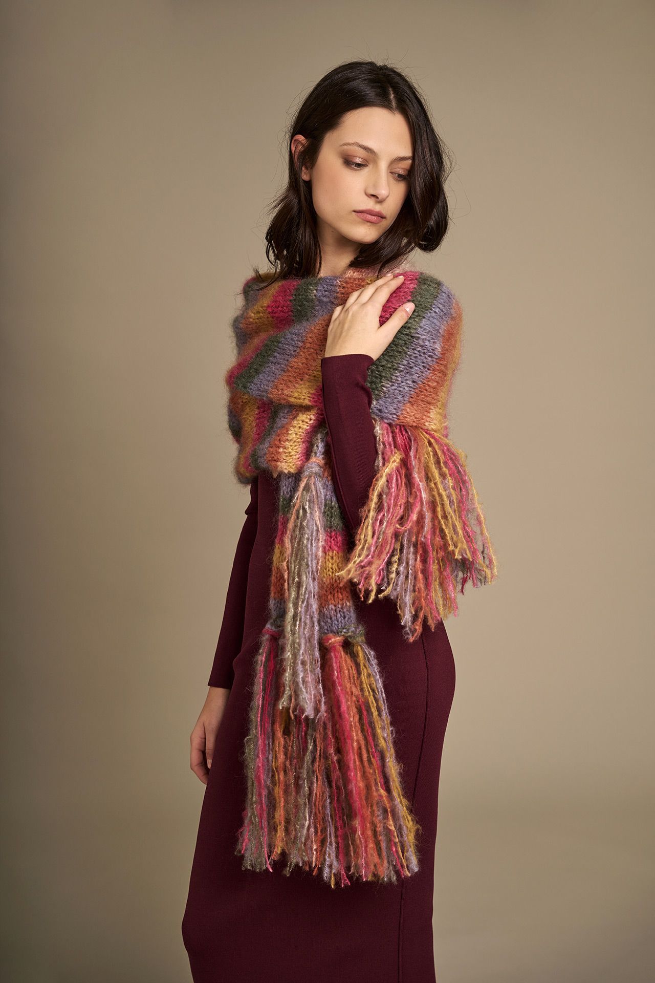 Per la sciarpa usare 3 gomitoli, per la frangia usare 1 gomitolo.
