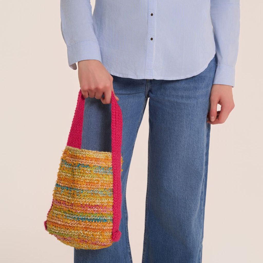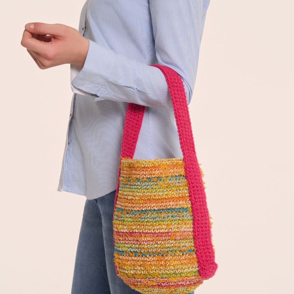Con il filato Natual bag fucsia, avv. 111 cat, lasciando all'inizio una coda di circa 35 cm per cucire.