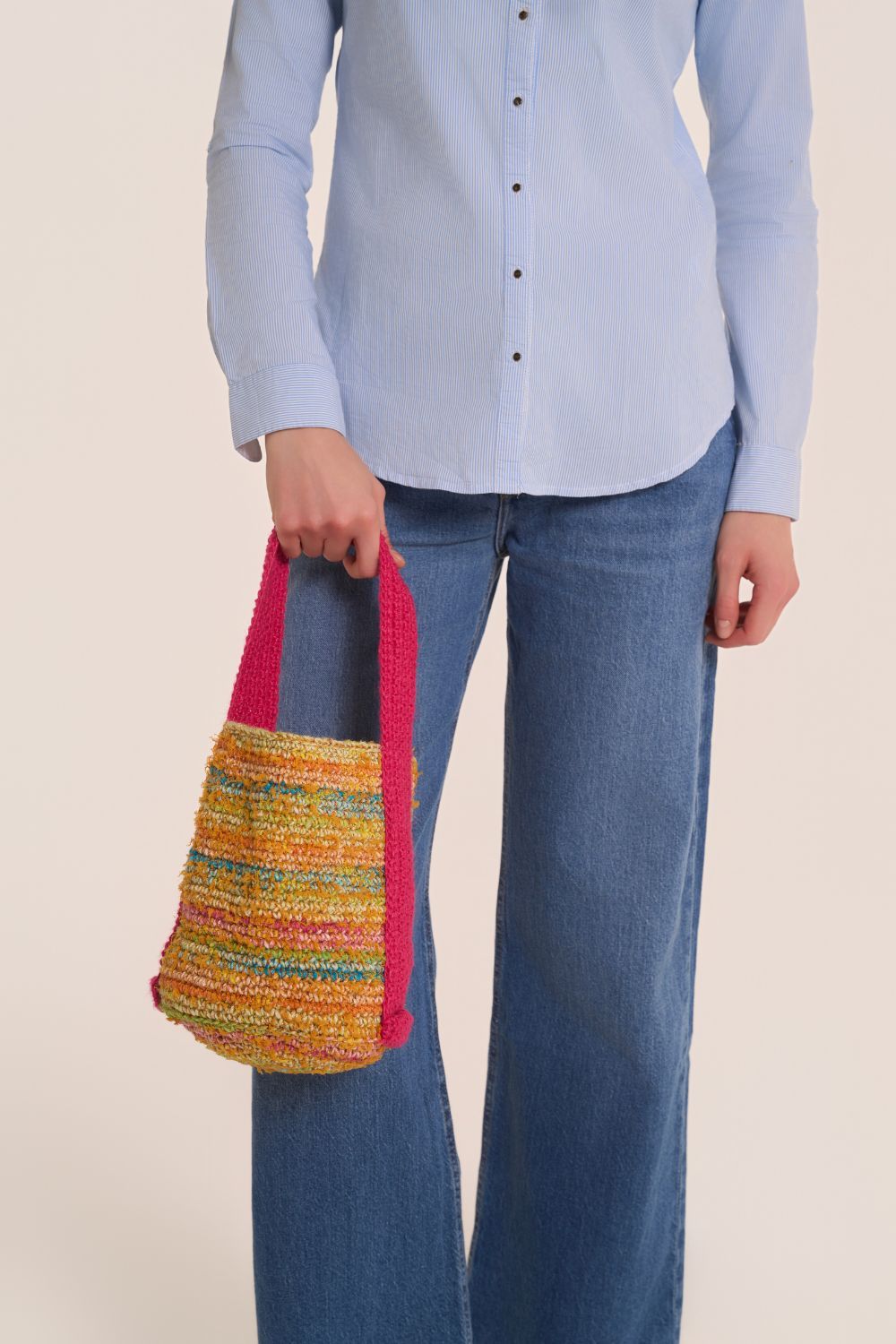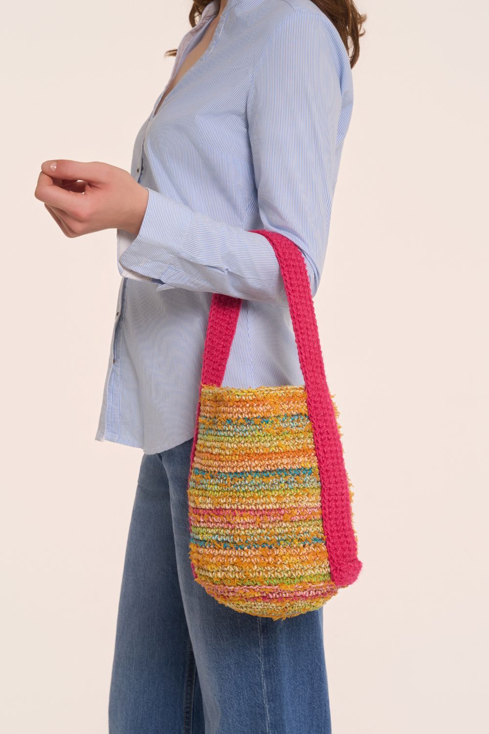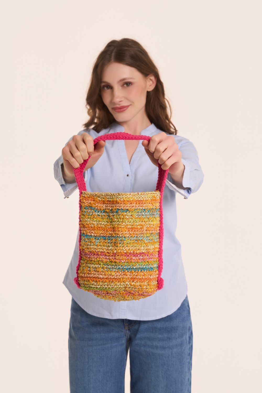 La borsa, si lavora dal basso verso l'alto. La base si esegue in tondo, chiudendo ogni giro con 1 mbss. Per facilitare il lavoro, inserire 1 MP nella 1a mb di ogni giro, spostandolo verso l'alto man mano che si procede. Il manico è formato da una lunga fascia, di cui la prima e l'ultima parte vengono cucite verticalmente lungo entrambi i lati del corpo della borsa.