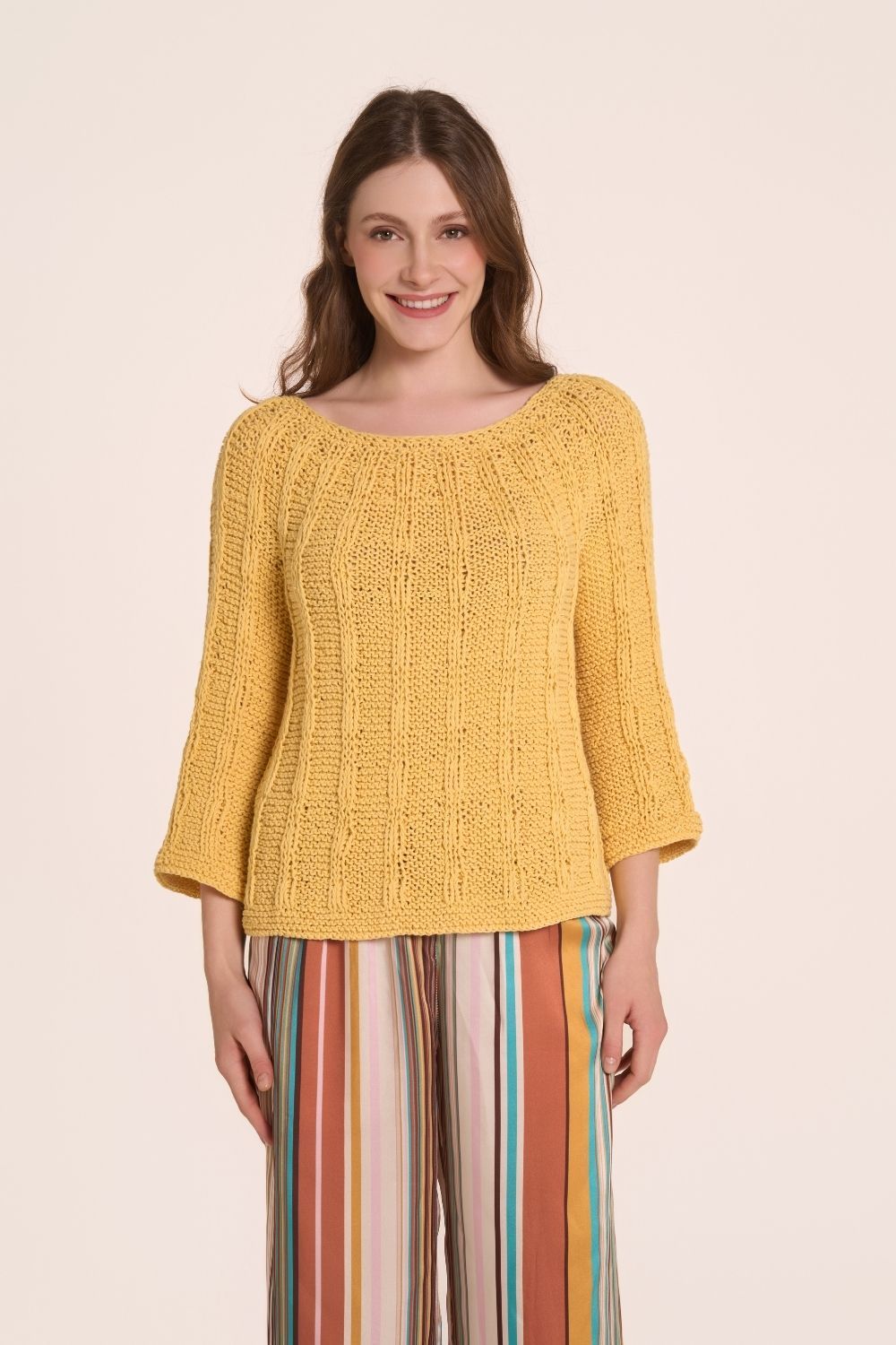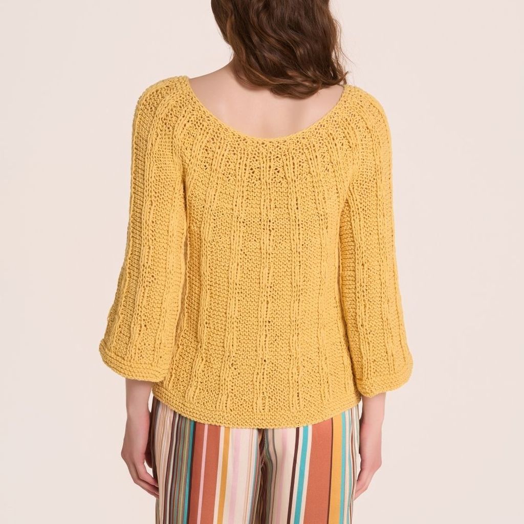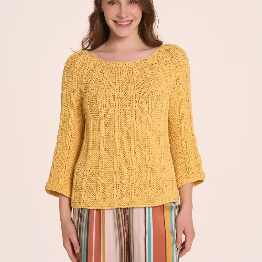 Il capo è lavorato in tondo e senza cuciture, con la tecnica top down (dall'alto verso il basso). Le maniche sono realizzate in tondo con la tecnica magic loop. Le indiazioni di seguito sviluppano la taglia S, per le altre taglie seguire le indicazioni tra parentesi (M-L-XL).