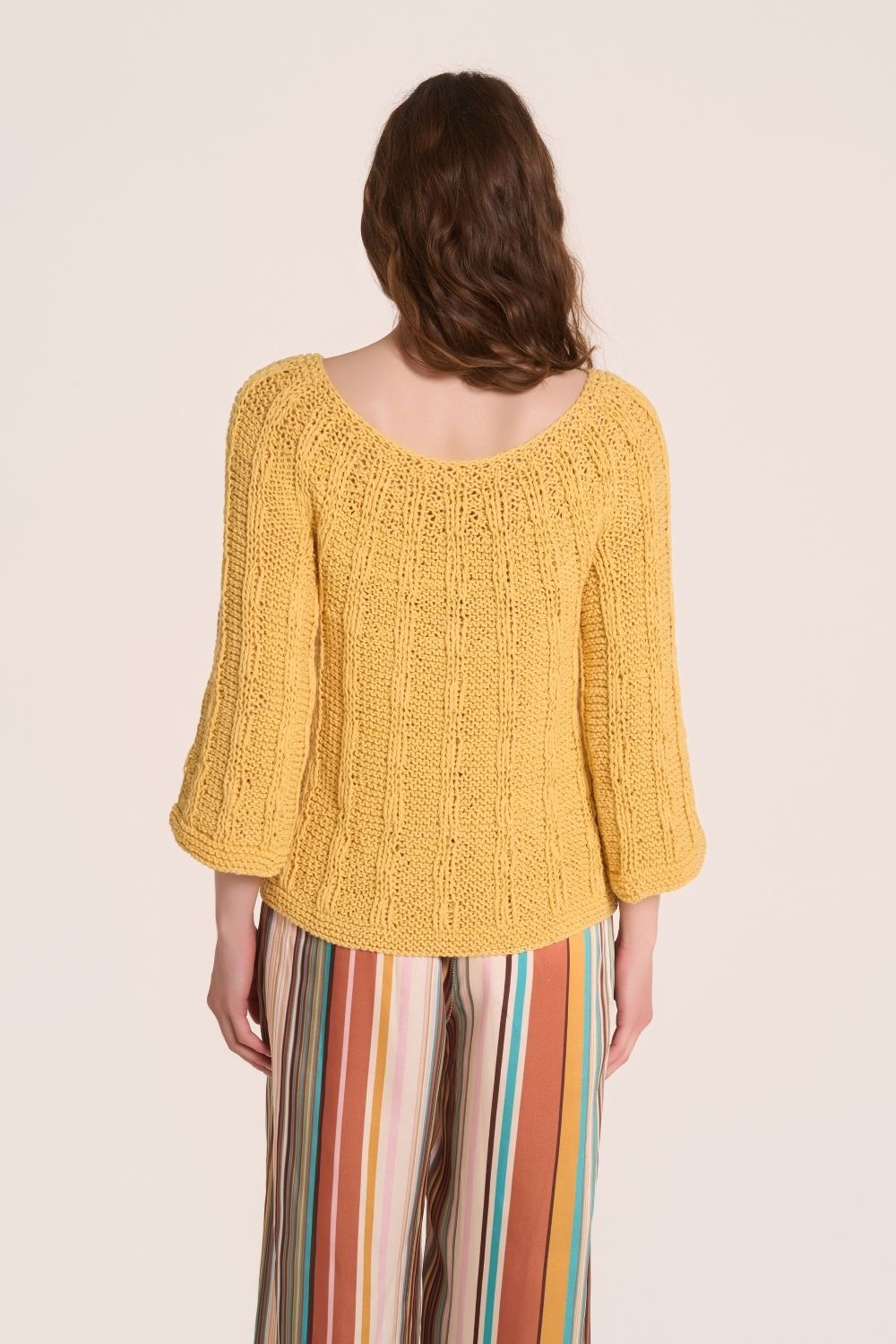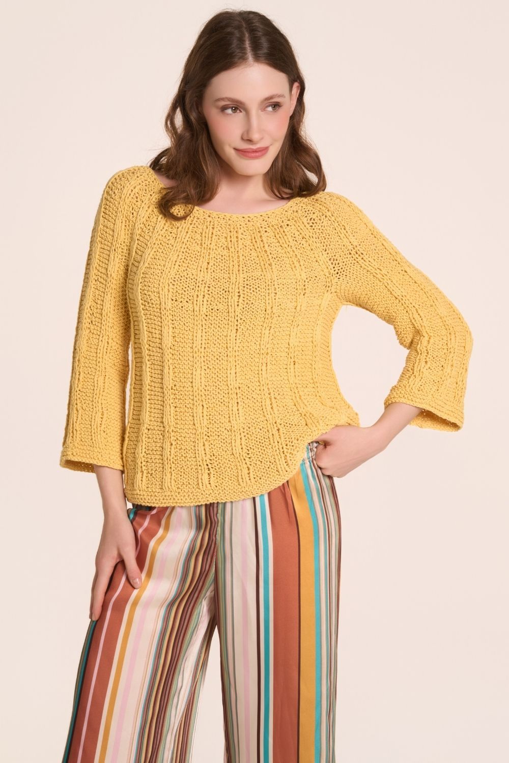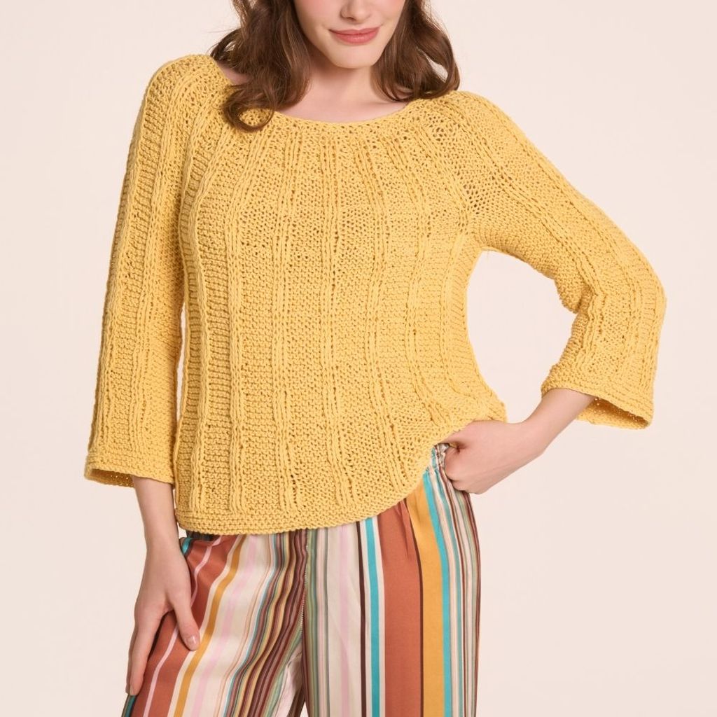 Il capo è lavorato in tondo e senza cuciture, con la tecnica top down (dall'alto verso il basso). Le maniche sono realizzate in tondo con la tecnica magic loop. Le indiazioni di seguito sviluppano la taglia S, per le altre taglie seguire le indicazioni tra parentesi (M-L-XL).